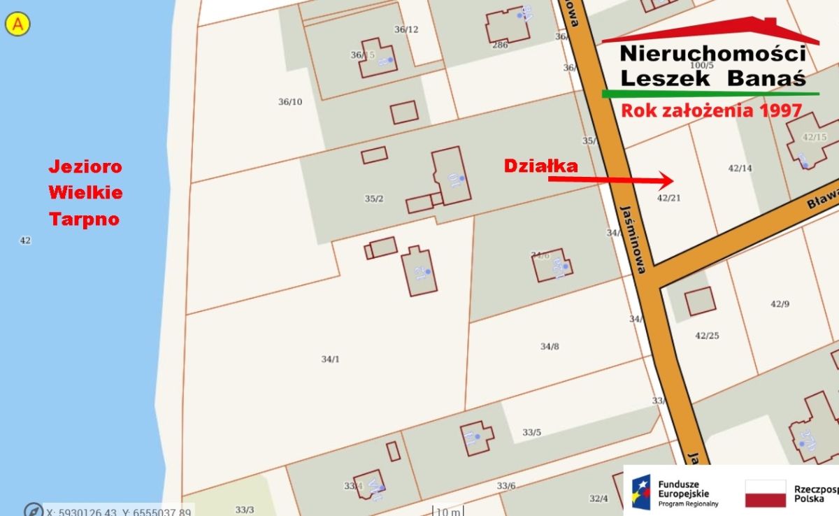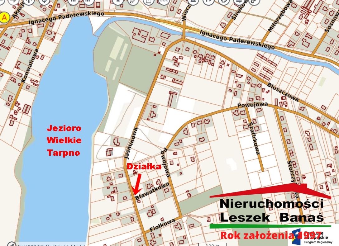 Działka budowlana położona przy ulicy Jaśminowej róg Bławatkowej bardzo blisko Jeziora Wielkie Tarpno. Wszystkie media wzdłuż działki prąd , gaz , woda , kanalizacja , sieć telefoniczna. Nowe oświetlenie uliczne.
