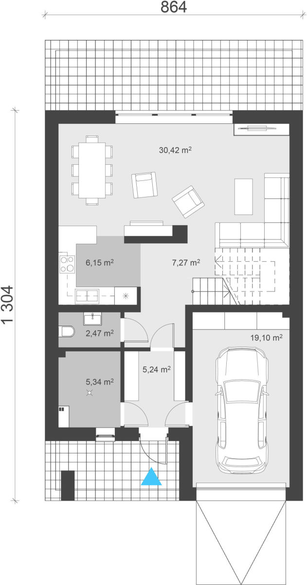 Parter: Pokój dzienny z jadalnią 30,42 m2 , Kuchnia 6,16 WC 2,47 m2 , Wiatrołap 5,24 m2 , Korytarz 7,27 m2 Pomieszczenie Gospodarcze 5,34 m2 , Garaż 19,10 m2