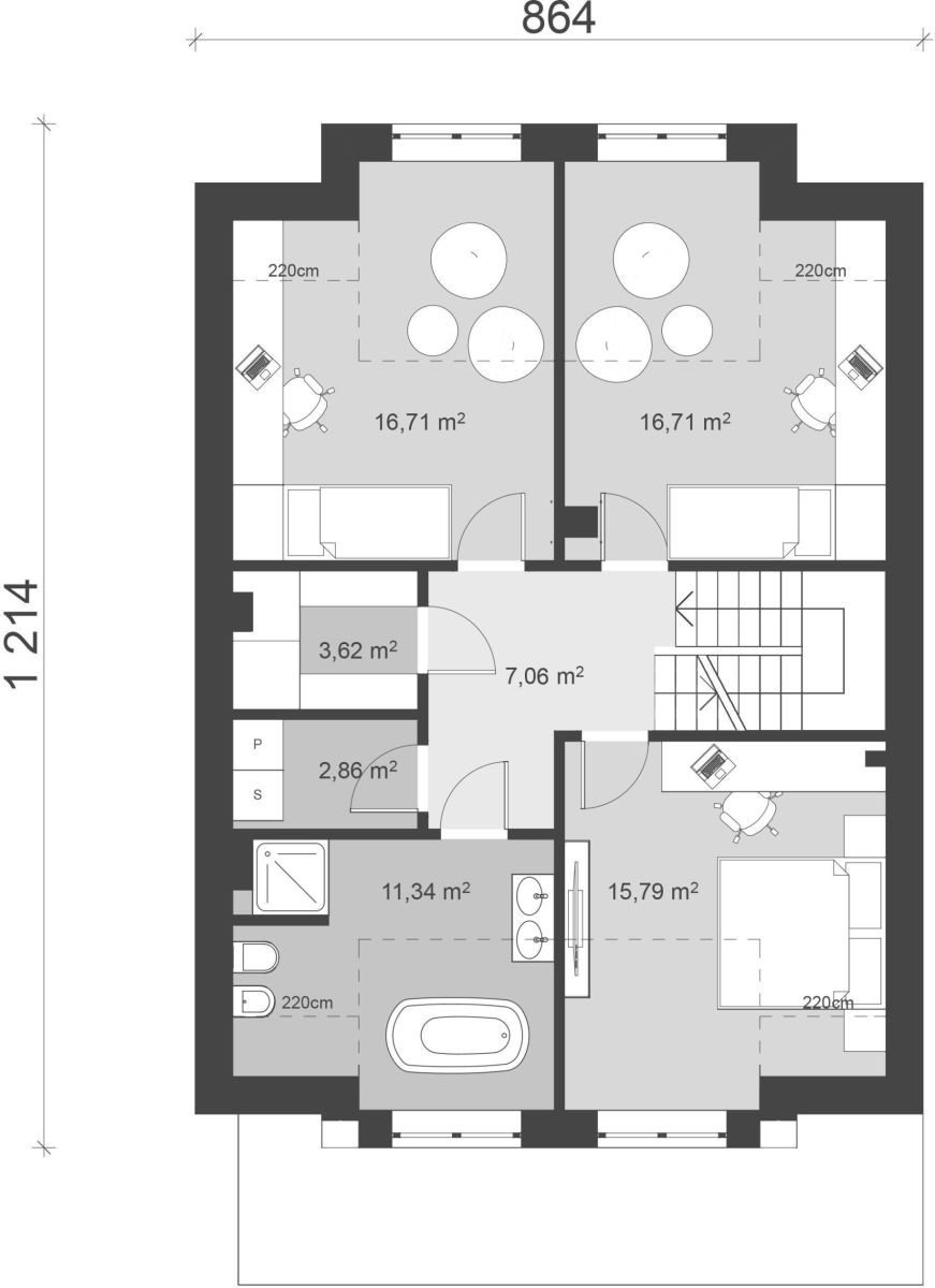 Poddasze: Pokój 16,71 m , Pokój 16,71 m2, Pokój 15,79 m2 Łazienka 11,34 m2 , Garderoba 3,62 , Korytarz 7,06 m2 Pomieszczenie Gospodarcze 2,86 m2